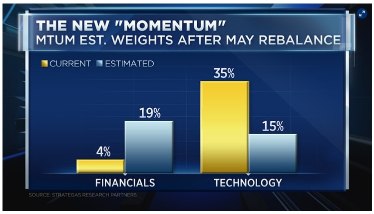 近年来,科技股一直是强势的代名词,在iShares安硕MSCI美国动量因素ETF(MTUM.US)中,科技股占了近35%的份额。据悉,该ETF将于五月底进行调整,Mills预计,科技股的权重可能会减少一半,而金融、非必需消费品和工业类股将占据最大权重。