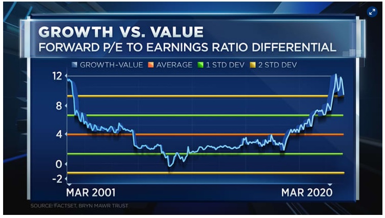 今年以来,价值股的出色表现只是将以科技股主导的成长型指数的市盈率溢价推回到高于均值2个标准差的水平。Mills表示,在估值差距正常化之前,我们还有很长的路要走。