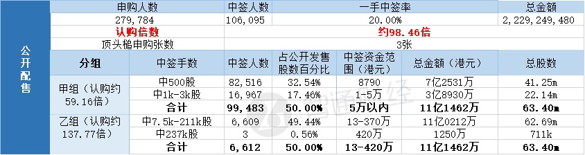其中,公开配售申购人数279784人,一手中签率20%,认购倍数约98.46倍。