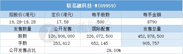 智通财经APP获悉,4月8日,联易融科技-W(09959)配售结束。配售招股价16.28-18.28港元,最终定价17.58港元,每手8790港元。