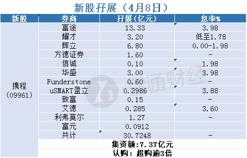 智通财经APP获悉,携程(09961)正在招股中。截至4月8日,辉立、耀才等合计为其借出30.7248亿港元,超购逾3倍。
