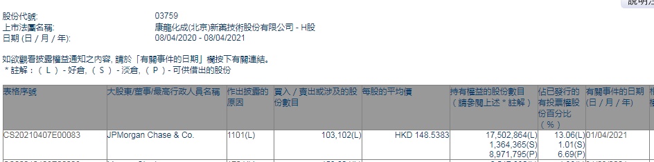智通财经APP获悉,香港联交所最新资料显示,4月1日,摩根大通增持康龙化成(03759)10.3102万股,每股作价148.5383港元,总金额约为1531.46万港元。增持后最新持股数目为1750.2864万股,最新持股比例为13.06%。