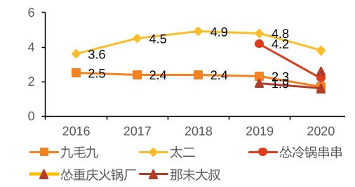2016-2019年九毛九品牌翻台分别为2.5、2.4、2.4、2.3、1.7。其集团旗下太二品牌2018年翻台率为4.9,2019年翻台率为4.8,2020年降至3.8。