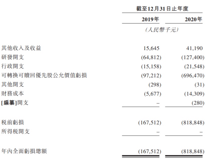 招股书显示,康诺亚生物的产品尚未获准进行商业销售,因此尚未从产品销售中产生任何收入。自公司成立以来,公司每年产生经营亏损。于2019年及2020年,公司分别产生全面亏损总额1.68亿元及8.19亿元。全面亏损总额主要来源于研发开支、行政开支及可转换可赎回优先股公允价值亏损。