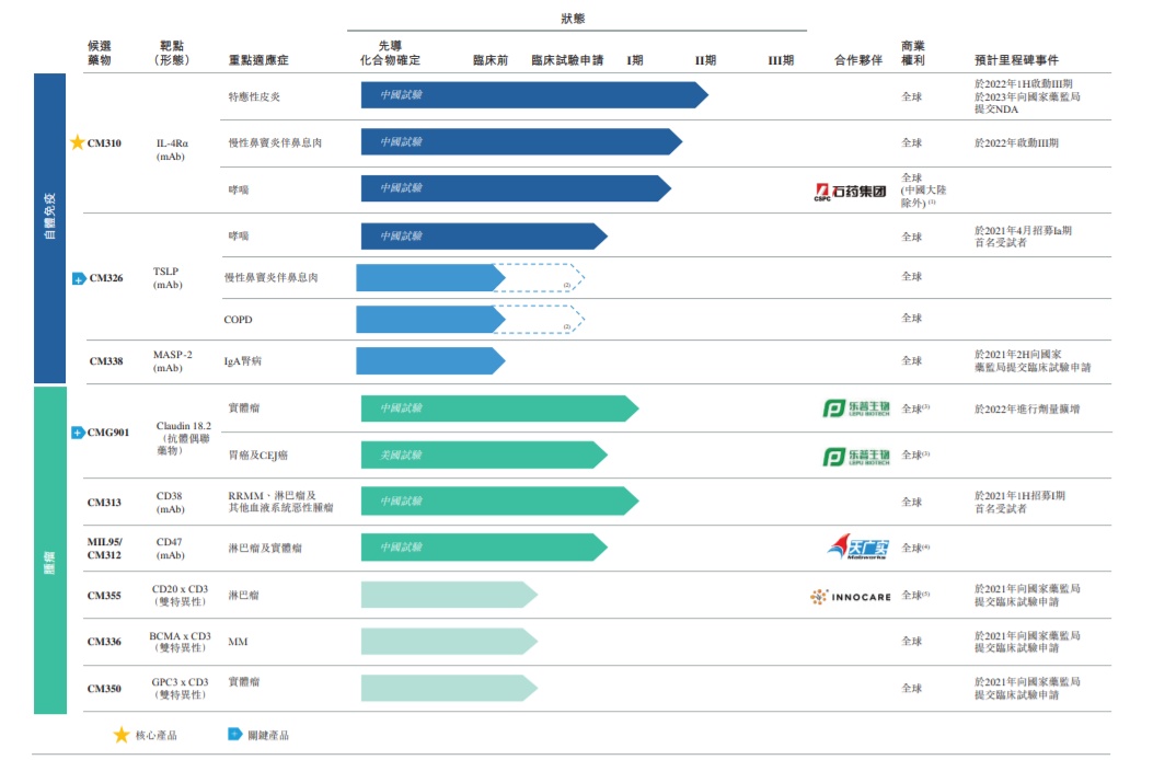 公司的主要候选药物包括CM326(TSLP抗体) 和CMG901(Claudin 18.2抗体偶联药物)。其中,CM326是针对胸腺基质淋巴细胞生成素(TSLP)的人源化高效单克隆抗体。其为中国首个全世界第三个获临床试验申请批准的国产TSLP靶向抗体。CMG901是靶向Claudin 18.2的抗体偶联药物,含Claudin 18.2特异性抗体、可裂解连接子及毒性载荷单甲基澳瑞他汀E (MMAE)。其为首个在中国及美国取得临床试验申请的Claudin 18.2抗体偶联药物。