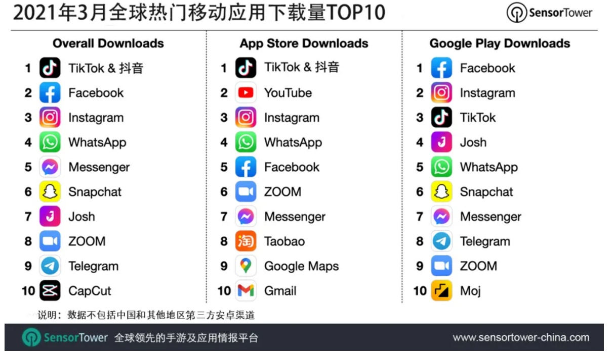 智通财经APP获悉,Sensor Tower 商店情报数据显示,2021年3月抖音及其海外版TikTok以5800万下载量,蝉联全球移动应用(非游戏)下载榜冠军。其中,抖音的下载量占11%,TikTok美国市场的下载量占比为10%。