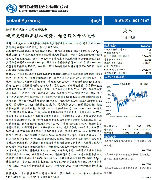 智通财经APP获悉,4月7日,东北证券发布首次覆盖研报,评价佳兆业(01638)城市更新业务独具核心优势,毛利率绝对水平位于行业较高位,给予公司买入评级。