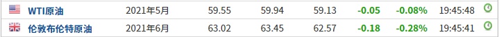 截至发稿,WTI原油跌0.08%,报59.55美元/桶。布伦特原油跌0.28%,报63.02美元/桶。