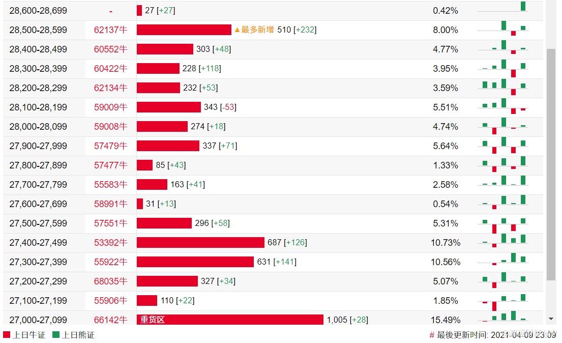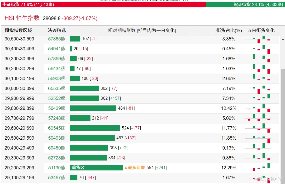 法兴恒指牛熊证街货分布图中的数据显示,熊证街货重货区和最多新增都在29200-29299区间,该区间最新熊证数量为554张,较上一交易日增加241张。牛证街货重货区在27000-27099区间,该区间最新牛证数量为1005张,较上一交易日增加28张;最多新增在28500-28599区间,该区间最新牛证数量为510张,较上一交易日增加232张。