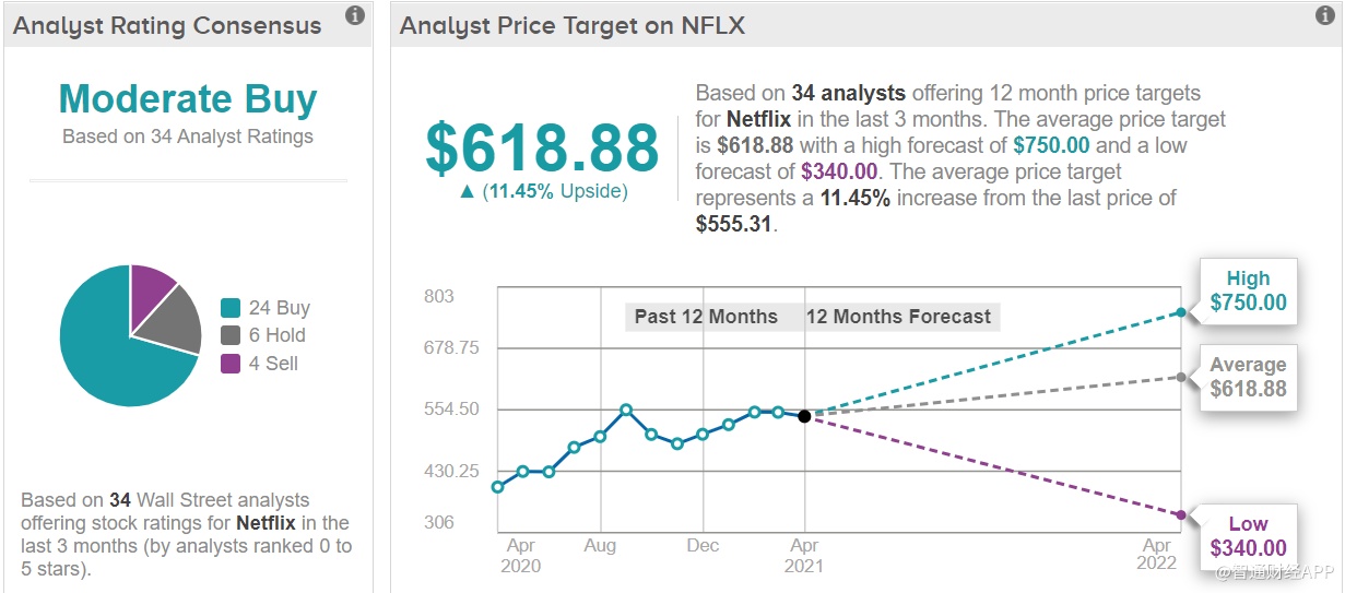 在过去三个月里,有24位分析师予Netflix“买入”评级,6位予“持有”评级,4位予“卖出”评级,共识评级为“温和买入”(Moderate Buy),平均目标价为618.88美元,意味着较当前股价有11%的上行潜力。