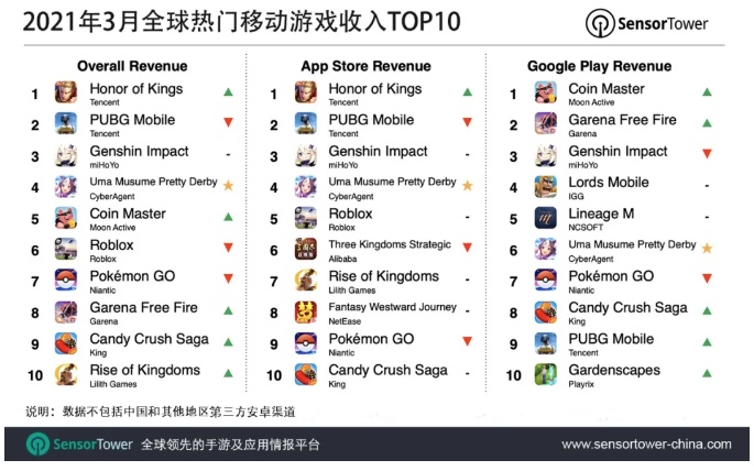 榜单前五另外三款游戏为米哈游《原神》、Cygames《赛马娘》,以及Moon Active《Coin Master》。