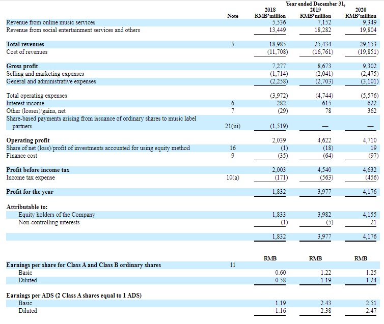 财报显示,腾讯音乐2020年总营收达291.53亿元,同比增长14.6%;净利润为41.76亿元,同比增长5%;归属股东净利润为41.55亿元,同比增长4.3%;摊薄后每ADS收益为2.47元,上年同期为2.38元。