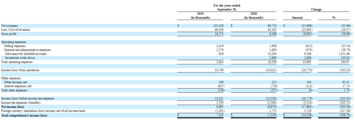 财报显示,2020财年净营收为6973.3万美元,同比下降33.86%;毛利润为656.8万美元,同比下降59.89%;净亏损897.4万美元,上年同期录得净利润869.1万美元。