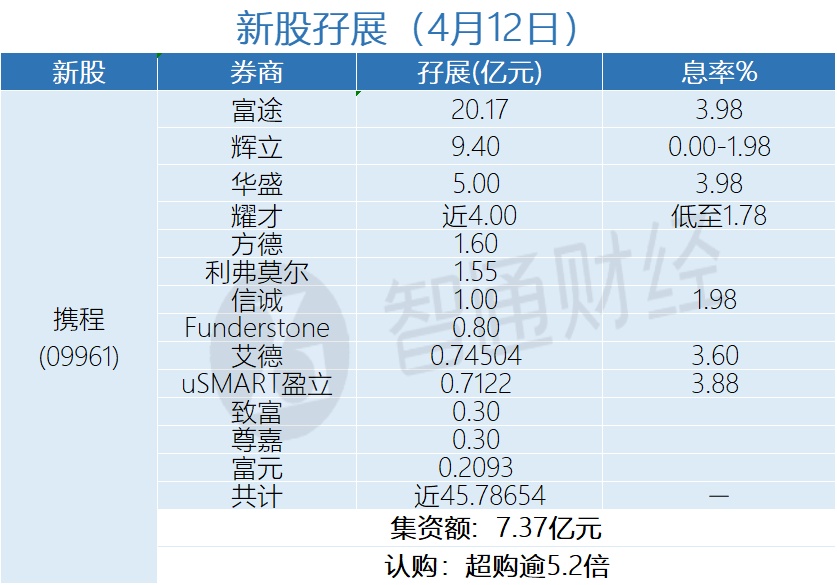 智通财经APP获悉,携程(09961)正在招股中。截至4月12日,辉立、耀才等合计为其借出45.78654亿港元,超购逾5.2倍。