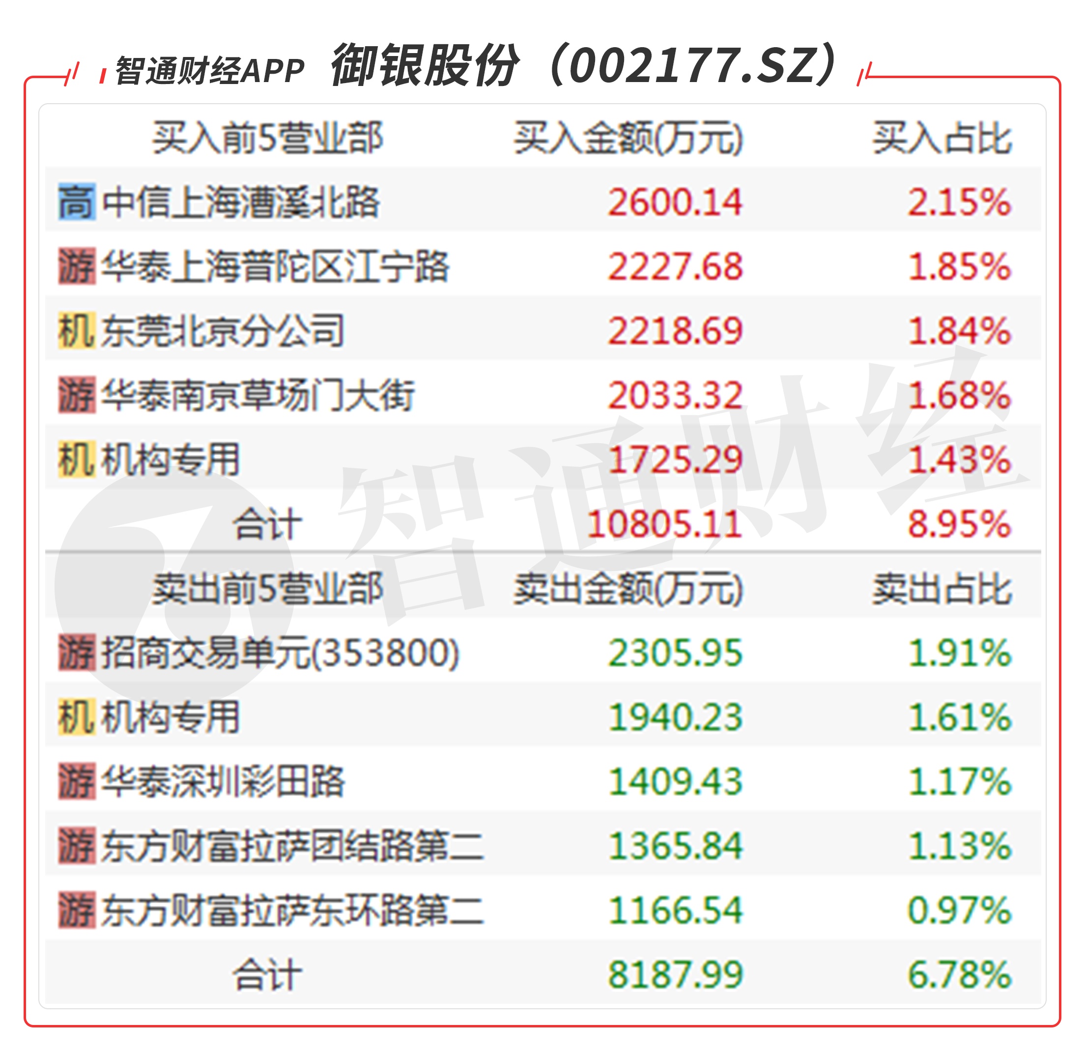 御银股份(002177.SZ):多主力现身龙虎榜,买一是知名游资的席位买入2600万元,买二是知名游资的席位买入2227万元,机构在对倒,买卖均衡,当日净买入5882万元,如果分歧承接有力,则有望突破前期高点7.99元。