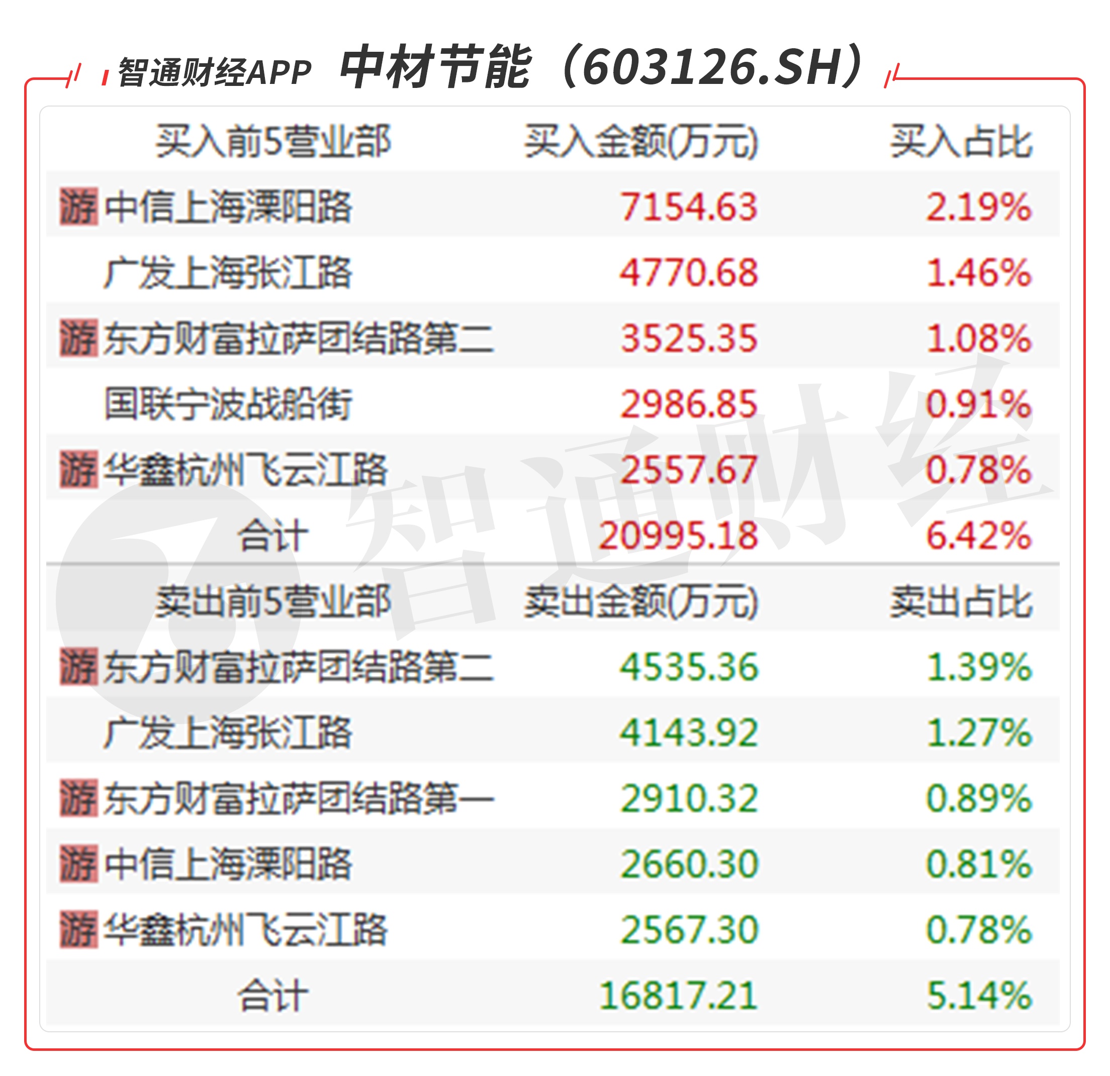 中材节能(603126.SZ):受多家游资青睐,有三家知名游资共买入1.32亿元,其中买一是知名游资孙哥的席位买入7155万元。当日净买入4178万元,该股主力深度介入,值得看高一线。