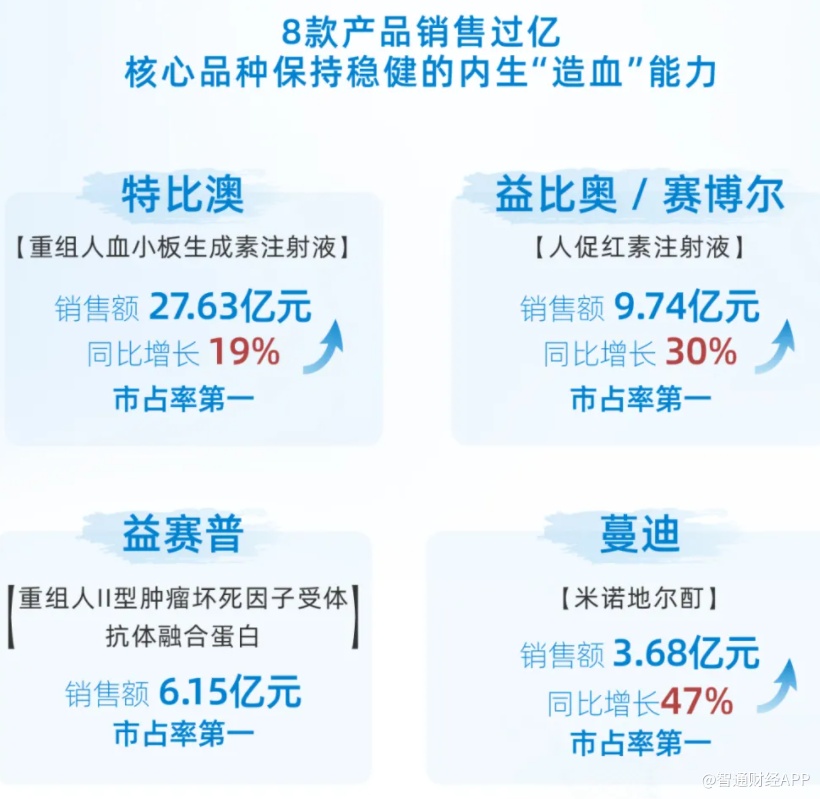 两种重组人促红素产品益比奥和赛博尔销售额跃升至9.74亿元,同比大幅增长30%;用于治疗类风湿性关节炎、强直性脊柱炎及银屑病的益赛普销售额6.15亿元;当期蔓迪销售额增至3.68亿元,同比增幅高达47%。