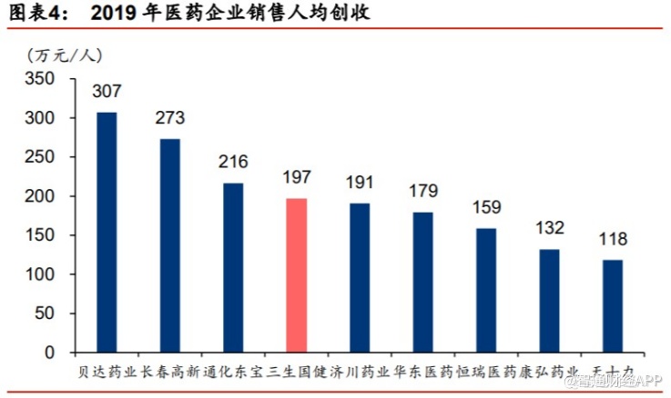 在销售端,三生制药拥有经验丰富的销售专业人士组成的营销团队,由3200多名专业销售人员组成的庞大销售及分销网络。目前其分销网络已覆盖国内所有的省、自治区、直辖市的超过2500家三级医院以及盖超过1.4万家二级医院或较低层级医院及医疗机构。与同行业相比,2019年三生制药销售团队人均创收规模处在国内医药行业第一梯队,体现出公司销售团队的高效。