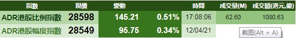 智通财经APP获悉,周一美股三大指数齐跌,港股ADR指数上扬,按比例计算,收报28598点,涨145.21点或0.51%。