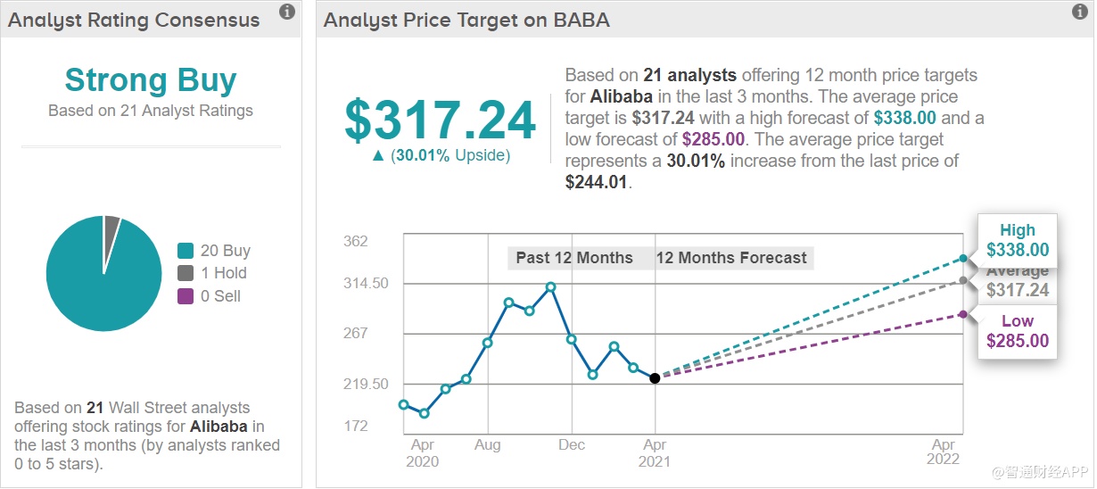 华尔街同样对阿里巴巴的前景充满信心,有20位分析师予“买入”评级,1位予“持有”评级,共识评级为“强烈买入”,平均目标价格为317.24美元,意味着该公司股价在未来12个月有30%的上涨空间。