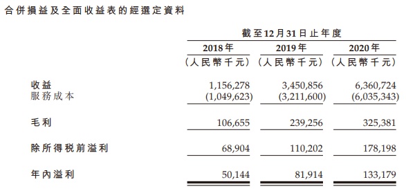 财务方面,2018-2020财政年度,该公司营收分别约为11.56亿元(人民币,下同)、34.51亿元及63.61亿元,2018-2020年盈利分别为5014.4万元、8191.4万元及1.33亿元。