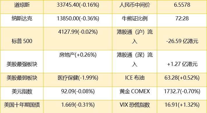 1、 美股收盘,道琼斯指数跌55.20点,跌幅0.16%,报33745.40点;标普500指数跌0.81点,跌幅0.02%,报4127.99点;纳斯达克综合指数跌50.19点,跌幅0.36%,报13850.00点。港股ADR指数上扬,按比例计算,收报28598点,涨145.21点或0.51%。