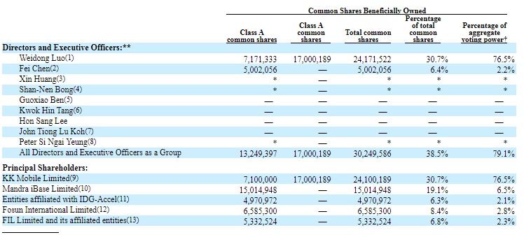极光董事会主席兼首席执行官Weidong Luo持有公司30.7%的股权,拥有76.5%的投票权;