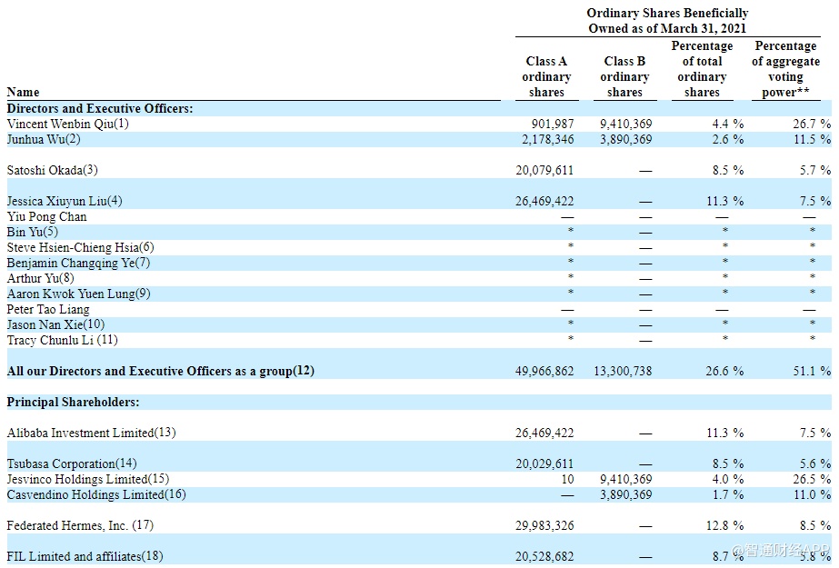 截至2021年3月31日,联合创始人、董事长兼首席执行官仇文彬持有公司4.4%的股权,拥有26.7%的投票权。联合创始人、董事兼首席增长官Junhua Wu持有公司2.6%的股权,拥有11.5%的投票权。