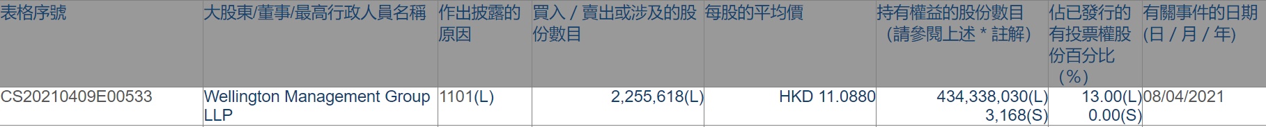 智通财经APP获悉,香港联交所最新资料显示,4月8日,Wellington Management增持龙源电力(00916)225.5618万股,每股作价11.088港元,总金额约为2501.03万港元。增持后最新持股数目约为4.34亿股,最新持股比例为13%。