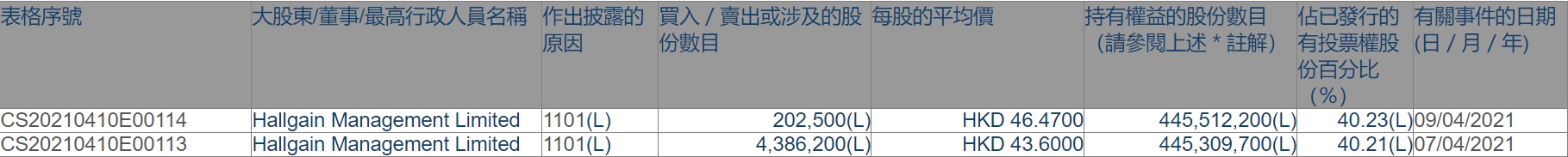 智通财经APP获悉,香港联交所最新资料显示,4月7日和4月9日,Hallgain Management Limited两日合计增持建滔集团(00148)458.87万股,每股作价分别为43.60港元和46.47港元。总金额约为2亿港元。增持后最新持股数目约为4.46亿股,最新持股比例为40.23%。