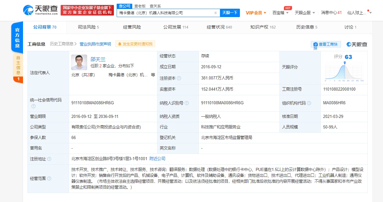 天眼查App显示,梅卡曼德(北京)机器人科技有限公司成立于2016年9月,是国内知名AI+3D+智能工业机器人解决方案提供商,专注于3D视觉领域软硬件产品研发、生产及销售。注册资本约381万人民币,法定代表人为邵天兰,公司经营范围主要包含技术开发;产品设计;模型设计;软件开发;工业机器人制造;通用仪器仪表制造等。