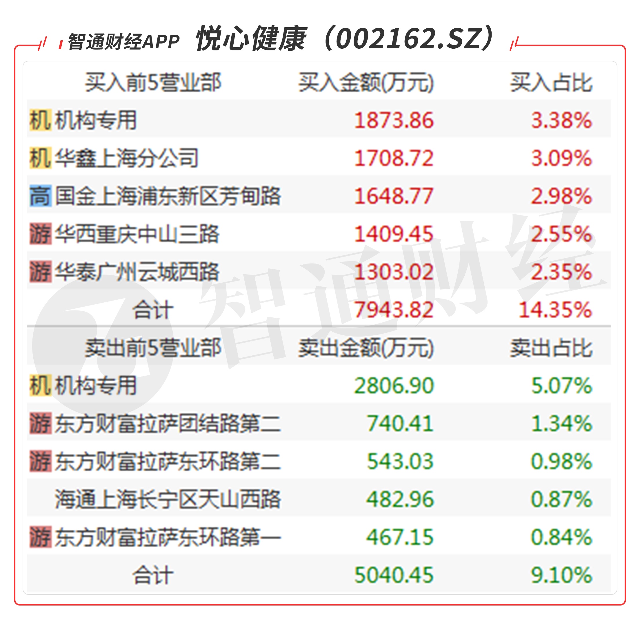 悦心健康(002162.SZ):多主力现身龙虎榜,买二是知名游资的席位买入1709万元,机构对倒,当日净买入4633万元,今日上板坚决,该股创近几年新高,再度往上拓展空间需要成交量配合。