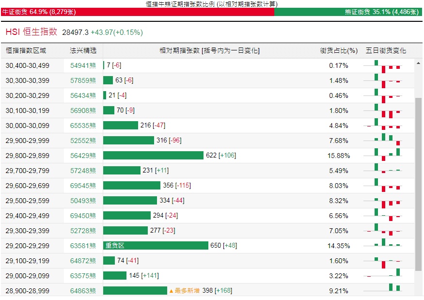 法兴恒指牛熊证街货分布图中的数据显示,熊证街货重货区在29200-29299区间,该区间最新熊证数量为650张,较上一交易日增加48张;最多新增在28900-28999区间,该区间最新熊证数量为398张,较上一交易日增加168张。