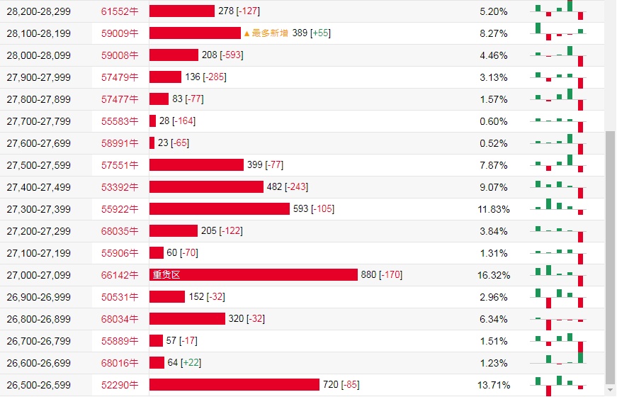 牛证街货重货区在27000-27099区间,该区间最新牛证数量为880张,较上一交易日减少170张;最多新增在28100-28199区间,该区间最新牛证数量为389张,较上一交易日增加55张。
