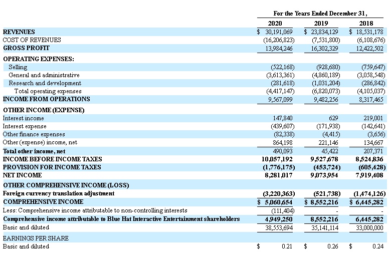 智通财经APP获悉,蓝帽子(BHAT.US)向美国SEC递交了20F报告,披露了公司截至2020年12月31日的2020年年报和最新股权结构,其中公司2020年营收为3019.1万美元,上年同期为2383.4万美元。