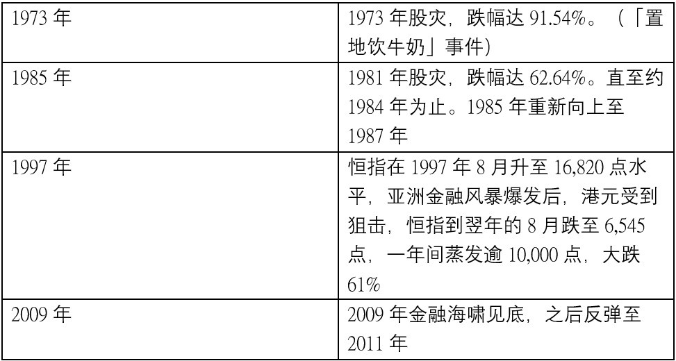 1981年:1981年7月恒指在这之前短短三年上升3.7倍。使香港地价节节上升,引发众多财团争夺持有土地的上市公司,同时香港前景未明之下及美国高利率,出现港元危机及银行风潮。股市大跌,跌幅达62.64%。