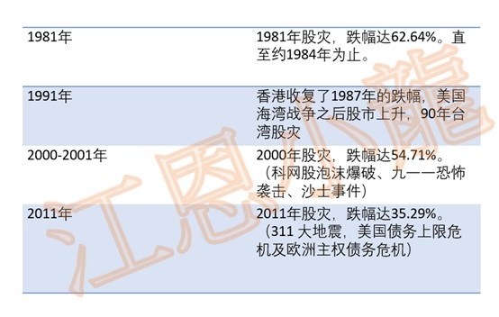 1991年:1987年股灾后,股市开始反弹。但是同时美国海湾战争,股市反而一直向上升至1994年。但同期台湾及日本股灾,日本土地价格开始大跌。