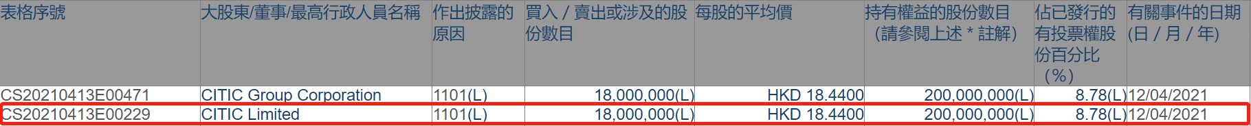 智通财经APP获悉,香港联交所最新资料显示,4月12日,中信股份增持中信证券(06030)1800万股,每股作价为18.44港元,总金额约为3.32亿港元。增持后最新持股数目为2亿股,最新持股比例为8.78%。