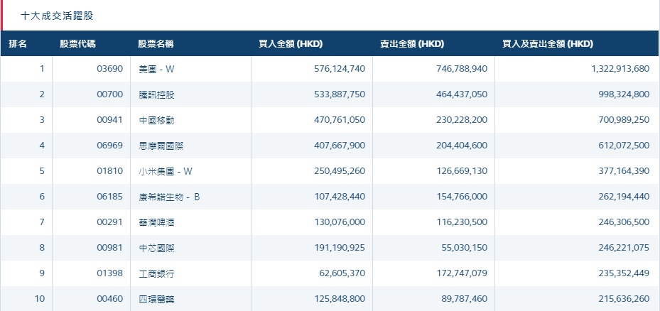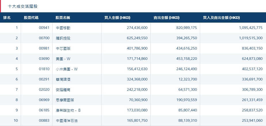 此外,中芯国际(00981)、思摩尔国际(06969)、中海油(00883)分别获净买入1.03亿、8265万、7766万港元。而工商银行(01398)、中国移动(00941)分别遭净卖出1.1亿、3.06亿港元。