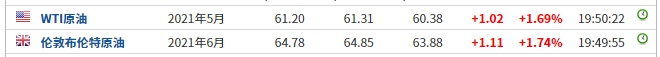 截至发稿,WTI原油涨1.69%,报61.20美元/桶。布伦特原油涨1.74%,报64.78美元/桶。