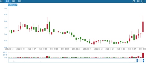 4月14日小幅高开后,短暂调整后迅速拉升,上午最高涨幅超过18%,下午一度回落涨幅收窄至8%,但尾盘上扬,全天收涨13%至7.98港元,成交量358万股,成交额2858万港元,换手率3.7%,较之前走势明显放量。至此,其股价从底部约6.4港元累计涨幅达到了25%。
