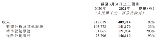 尤其值得关注的是,根据最新百融云创刊发的2021年第一季度经营摘要显示,随着公司服务的金融机构客户数量和客户需求持续增加,公司的数据分析服务保持高速增长;同期随着疫情后经济和消费的持续改善,金融业对于营销获客的需求快速反弹,亦促使公司在一季度服务于金融机构的精准营销服务及保险分销服务取得较高同比增长,公司一季度实现营收4.09亿,同比增幅达到92%,未来增长可期。