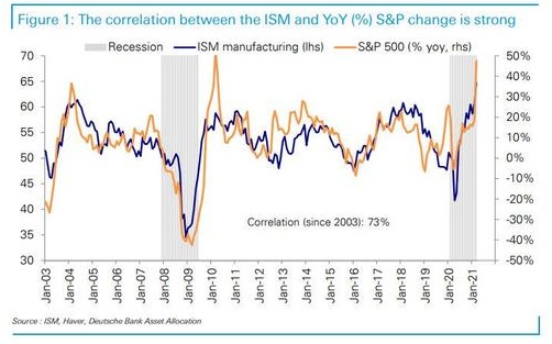 现在第三家银行加入了悲观团队。德意志银行首席股票策略师Binky Chadha的最新说明中,“从历史上来看,当增长达到顶峰时,股票和宏观周期指标比如ISM走势极为相近(相关性为73%),ISM通常在衰退结束后一年(10~11个月)达到峰值。现在来看,快到了”!