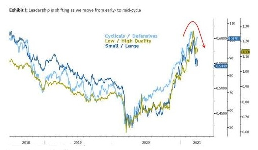 首先从摩根士丹利开始,摩根士丹利首席股票策略师迈克尔·威尔逊(Michael Wilson)上周末表示,尽管标准普尔500指数继续创下历史新高,但“从表面上看,决策层已经发生了明显转变。更具体地说,罗素2000年小盘股指数自3月12日触及峰值以来,表现落后标准普尔500指数8%。尽管此后一段历史上表现强劲,但相对强势已经破裂,在过去一年中,我们股票市场的周期性公司开始跑输大盘,而防御性股票表现更好一些。 如果这还不够的话,那么IPO和SPAC的指数已经跑输20%了”。