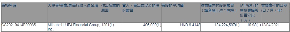 智通财经APP获悉,香港联交所最新资料显示,4月12日,三菱日联金融集团减持江苏宁沪高速公路(00177)40.6万股,每股作价9.4148港元,总金额约为382.24万港元。减持后最新持股数目约为1.34亿股,最新持股比例为10.98%。
