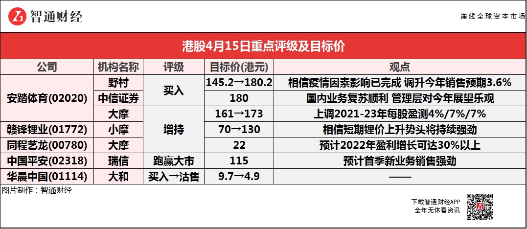 野村相信,疫情的因素影响已完成,调升安踏体育(02020)今年销售预期3.6%,预期增长率38.9%,目标价看高至180.2港元;