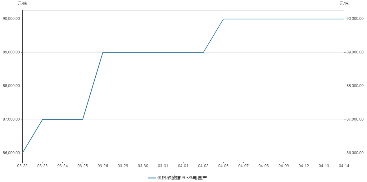 2020年Q4,随着电动车下游需求改善超预期,锂行业需求提升,在2020年9月进入超跌状态的锂价开始反弹,开启上涨进程:生意社数据显示,电池级碳酸锂价格从1月份的63000元/吨,已上涨至4月份的90000元/吨;在工业级碳酸锂方面,产品价格从59000元/吨附近,也已拉升至86000元/吨左右。