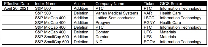 智通财经APP获悉,4月15日,标普道琼斯指数公司宣布,将对标普500指数、标普中型股400指数和标普小型股600指数进行以下调整,调整将于4月20日(周二)开盘前生效: