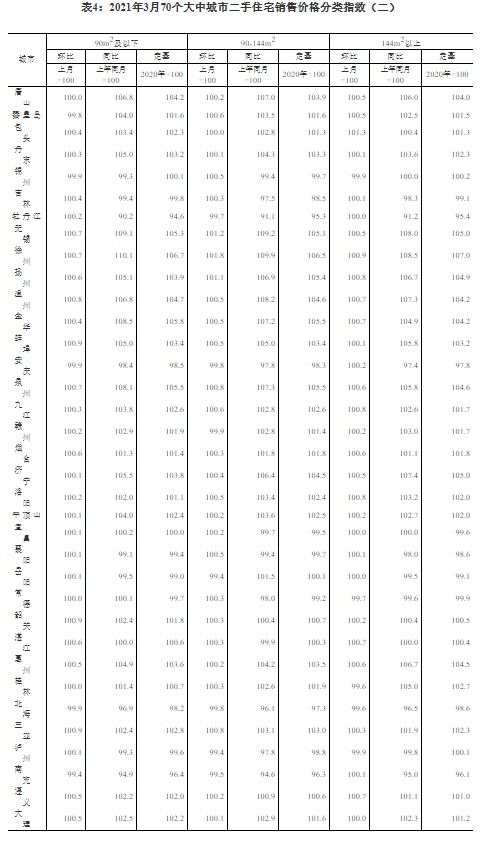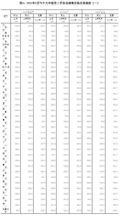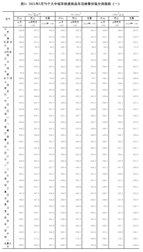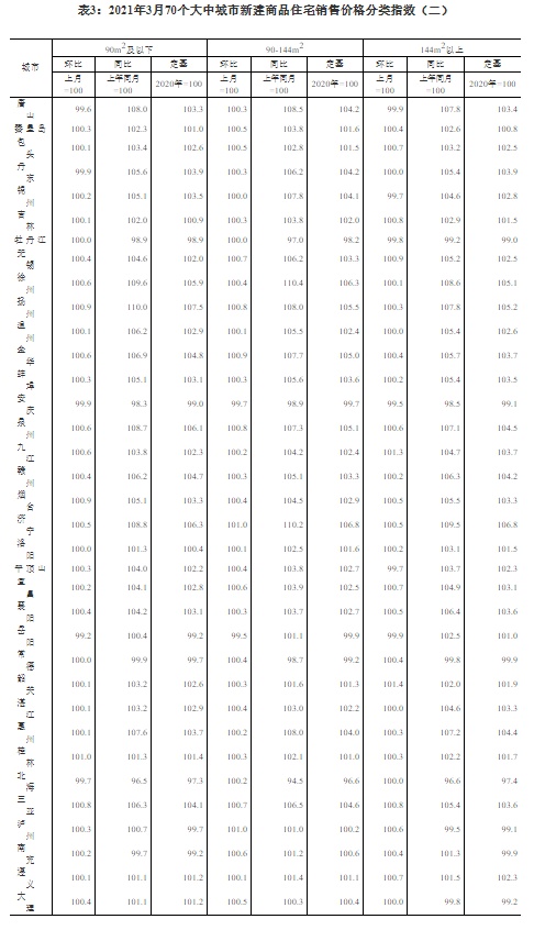 主要受上年同期低基数影响,各线城市商品住宅销售价格同比涨幅均有所扩大。据测算,3月份,一线城市新建商品住宅和二手住宅销售价格同比分别上涨5.2%和11.4%,涨幅比上月分别扩大0.4和0.6个百分点。二线城市新建商品住宅和二手住宅销售价格同比分别上涨4.8%和3.3%,涨幅比上月分别扩大0.3和0.4个百分点。三线城市新建商品住宅和二手住宅销售价格同比分别上涨3.9%和2.3%,涨幅比上月分别扩大0.3和0.4个百分点。