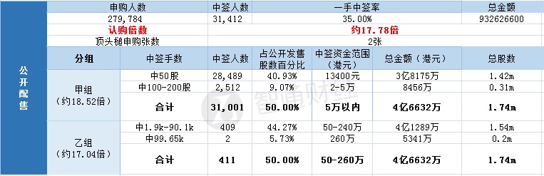 其中,公开配售申购人数279784人,一手中签率35%,认购倍数约17.78倍。